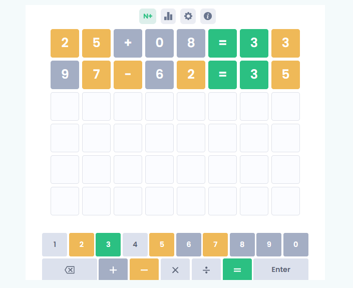 Nerdle is a daily math puzzle that makes numbers fun. You try to guess a hidden equation using numbers and basic math symbols, just like you guess a word in Wordle. Each puzzle is eight characters long, including an equals sign, and you get six chances to crack it.